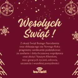 Drodzy klienci i współpracownicy ! Dziękujemy Wam za owocny rok 2024, za ogromną ilość wspólnie zrealizowanych kampanii reklamowych Dziękujemy za wybór naszej agencji Wasza satysfakcja jest dla nas najważniejsza! Dziękujemy za zaufanie i polecamy się na przyszłość Zespół BusWiFi życzy Państwu pełnych ciepła, spokoju i radości Świąt Bożego Narodzenia